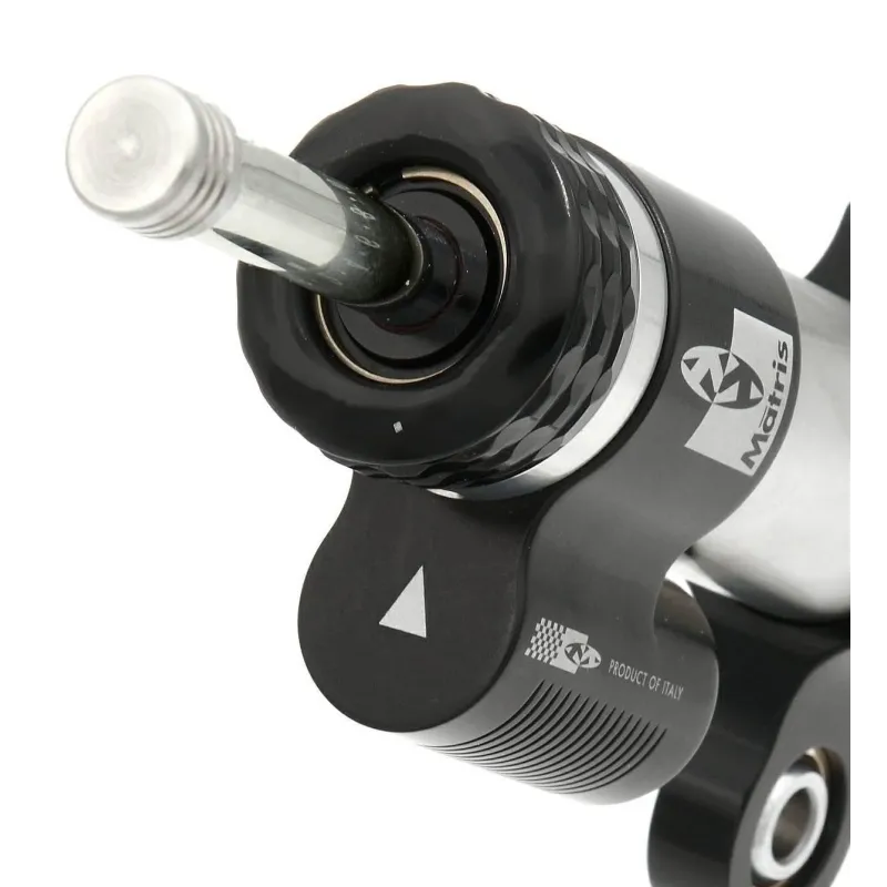 El amortiguador de dirección Matris SD.T112K para Triumph Speed Triple 1050R tienen una estética absolutamente racing peroelegante. Todas las piezas (como todos los productos Matris) están mecanizadas por cnc a partir de un sólido. ¡Ningudro exterior en titanio y cilindro interior coaxial en aluminio. Vástago monovástago de acero de alta resistencia, revestido de cromo duro y con un tratamiento superficial con acabado lapeado para garantizar un rozamiento “cero” efectivo.