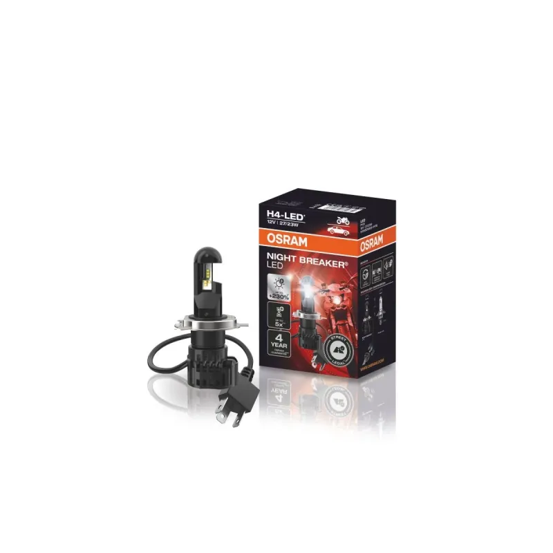 Bombilla LED H4 Osram Night Breaker HOMOLOGADA EN ESPAÑA de Osram con referencia 64193DWNB con una tonalidad de 6000K Luz Blanca Frío con una intensidad de 1.650Lm/1000Lm y una potencia de 27W/23W, es mas brillante que las Bombillas Halógenas convencionales, Bombilla para cortas y largas y valida para casquillo H4, gama Homologada para Moto.