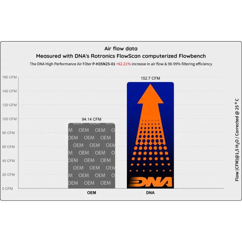 ✅ Aumento significativo de flujo de aire: +62,21% respecto al filtro OEM Honda. Flujo DNA: 152,7 CFM frente a 94,14 CFM del filtro original, ambos medidos a 1,5" H₂O y corregidos a 25 °C.