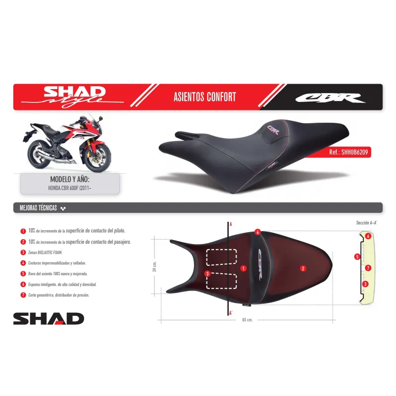 El asiento confort SHAD para moto Honda CBR 600F 2011-2012, está diseñado y desarrollado exclusivamente para el modelo MP3, con un diseño específico que potencia la ergonomía y el confort, incremento de la Superficie de contacto de piloto y pasajero, y con tecnología 3D-MESH.
