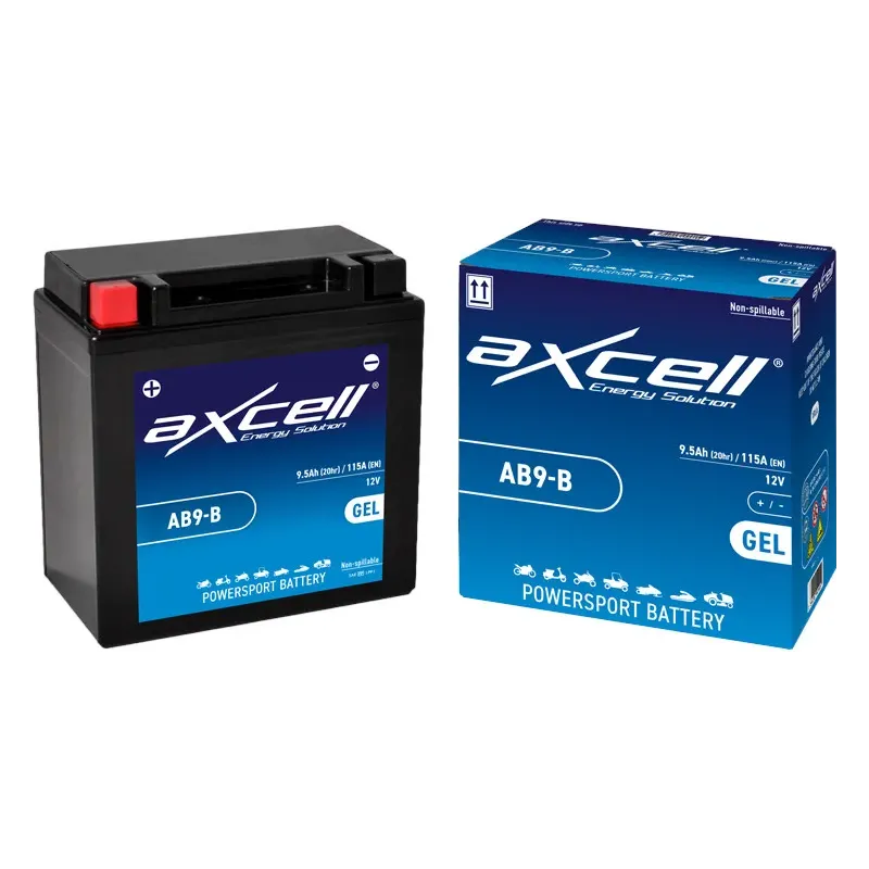 Batería moto AXCELL GEL AB9-B. Las baterías AXCELL GEL para moto ofrecen las mejores prestaciones y comodidad! Listas para usar y completamente a prueba de derrames. Las baterías de gel se activan de fábrica y no requieren ningún llenado inicial de ácido o recarga de agua. ¡Solo instalarla y olvidarte! Con alta vibración resistencia, las baterías de gel son la mejor opción para todos los deportes motorizados, todo terreno y usos extremos.